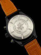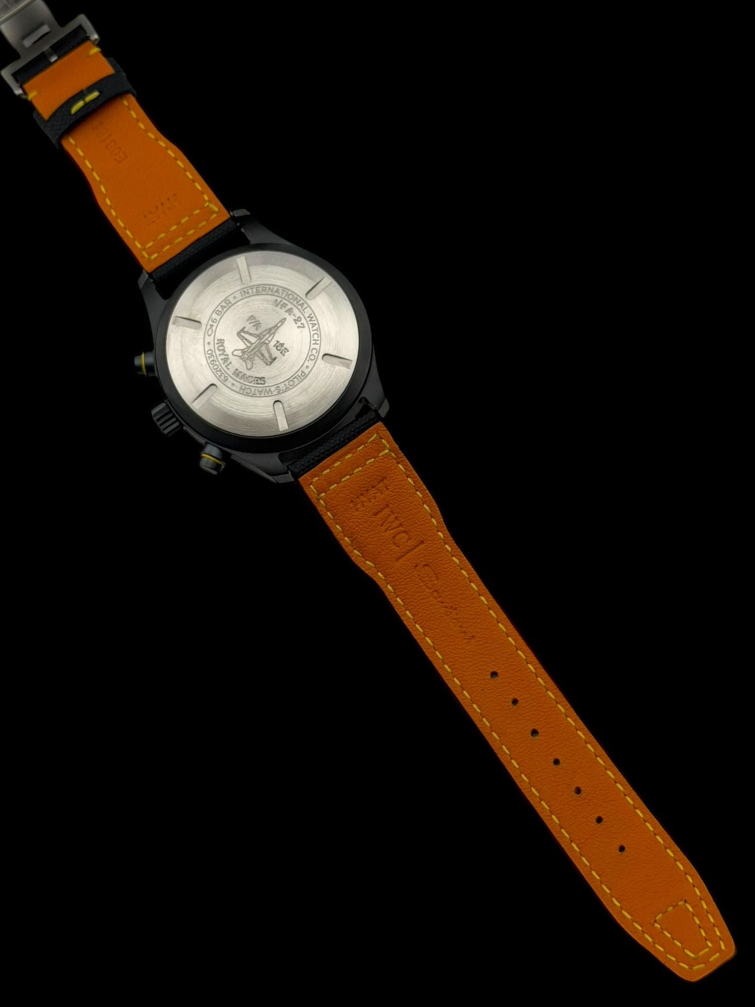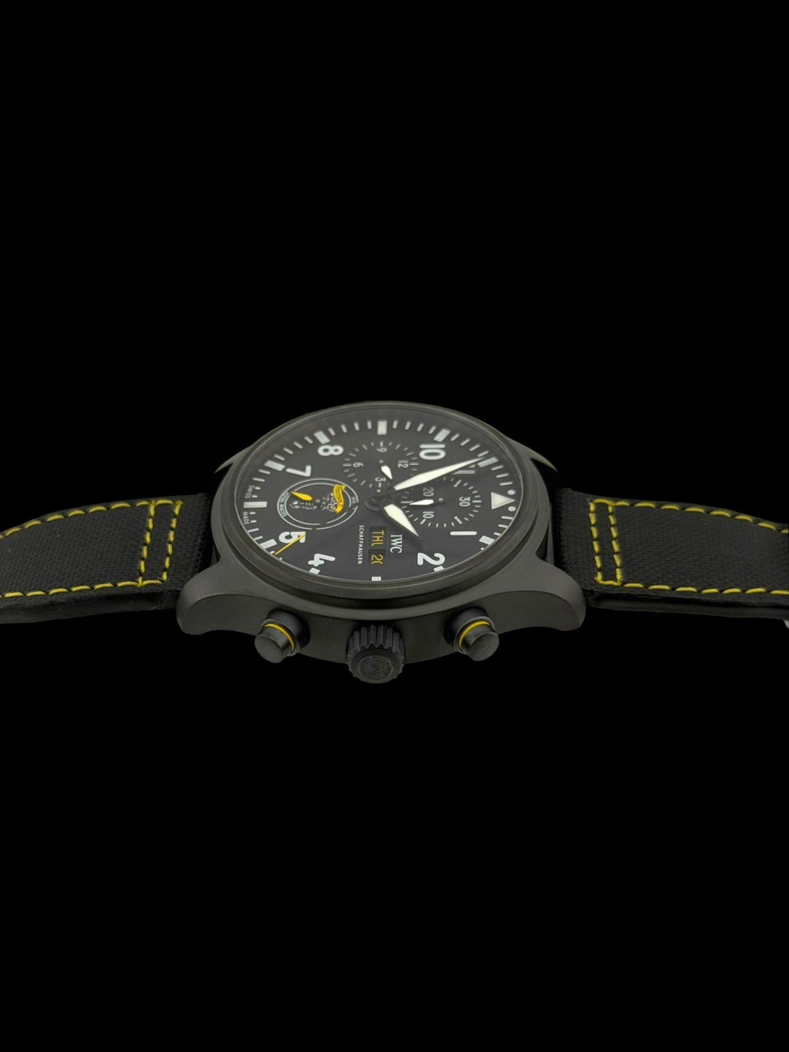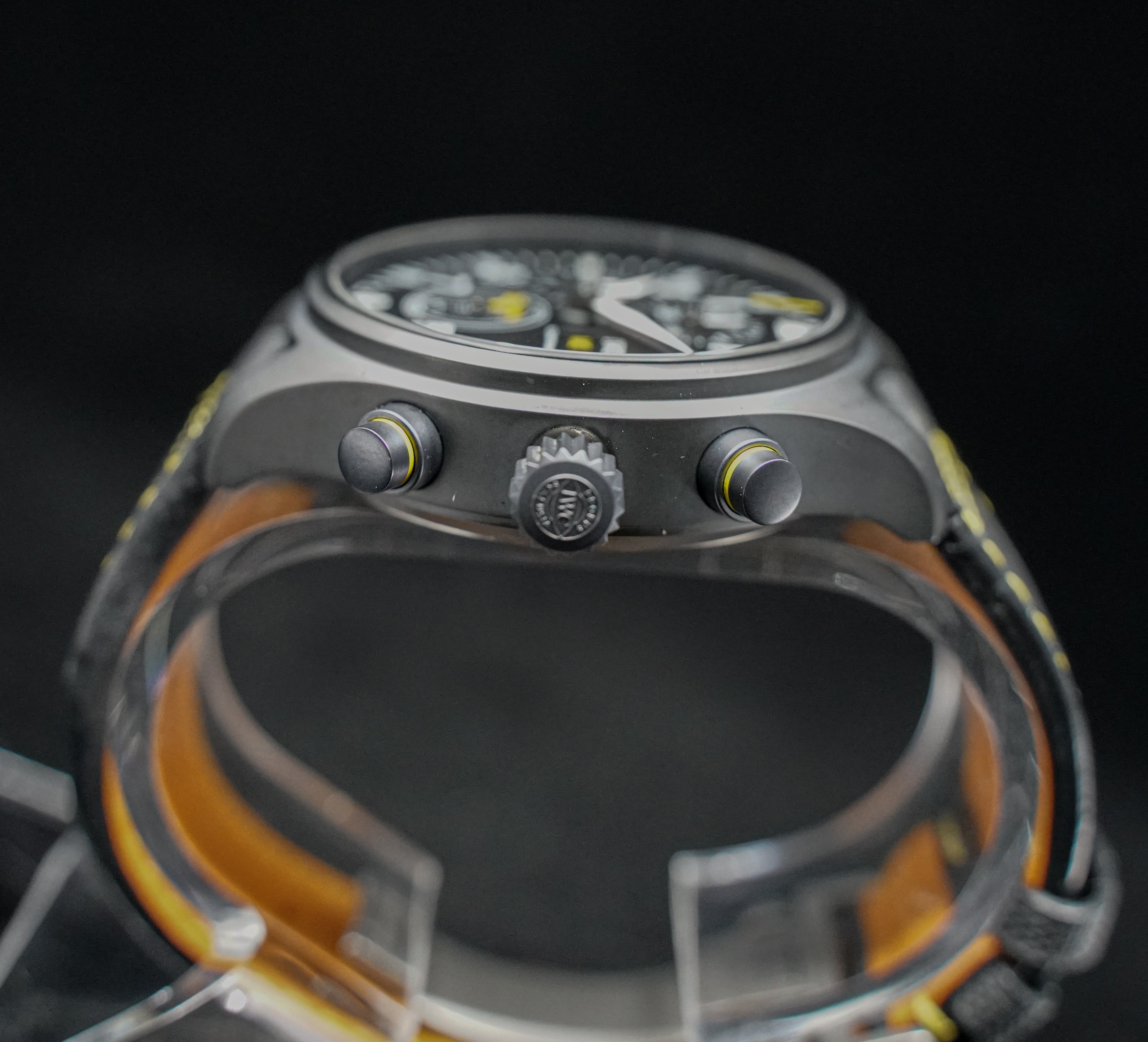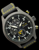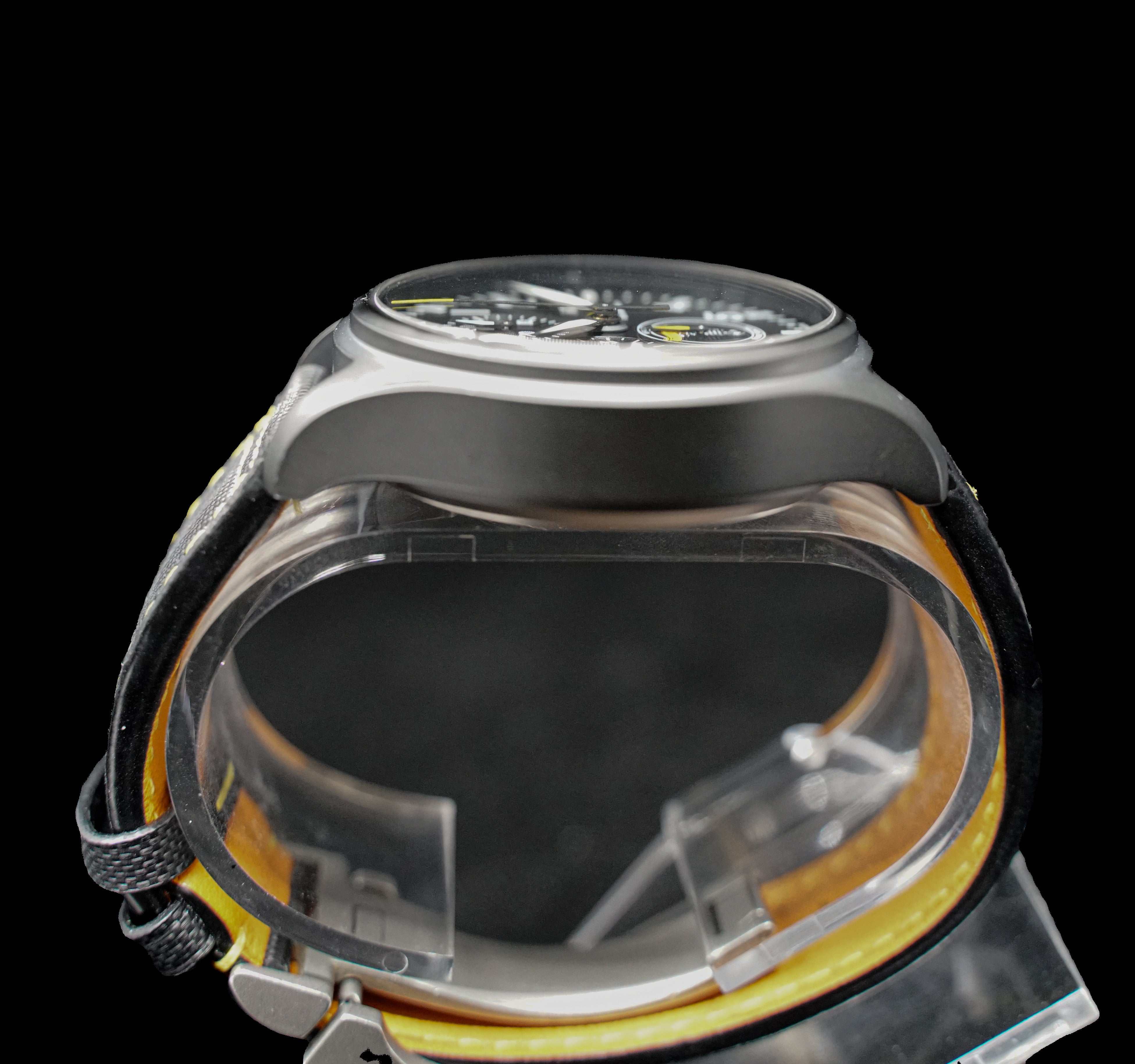 Chronograph with day-date, hours, minutes, small seconds Crystal: Sapphire with anti-reflective coating, secured against pressure drops Water resistance: 6 bar (60 m) Strap: Black calfskin with yellow stitching + folding clasp Exclusive: